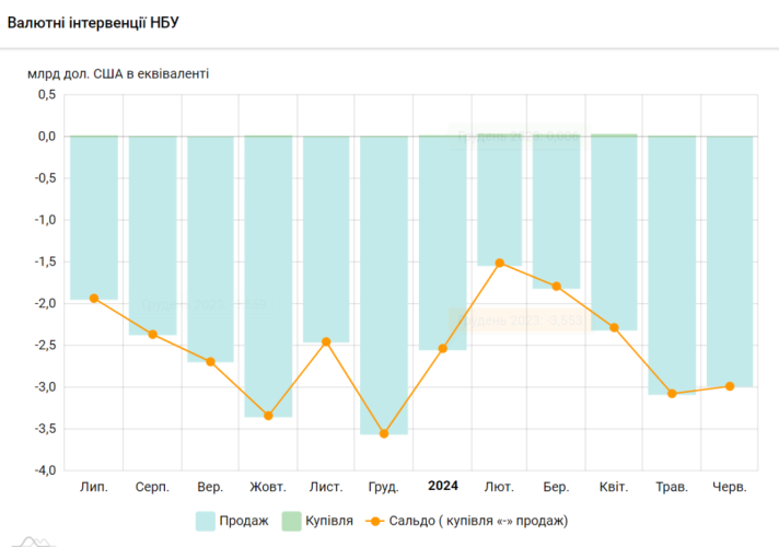 Згідно з результатами валютних інтервенцій, із 24 по 28 червня 2024 року Національний банк України продав на міжбанківському валютному ринку 670,9 млн дол. США, а також купив 0,49 млн дол. США.