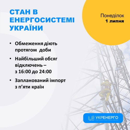 Повідомляється також, що 30 червня Україна екстрено приймала надлишки електроенергії з енергосистеми Польщі. Сьогодні планується аварійне постачання з сусідніх європейських країн для формування резервів в енергосистемі та зниження обсягу обмежень споживання.