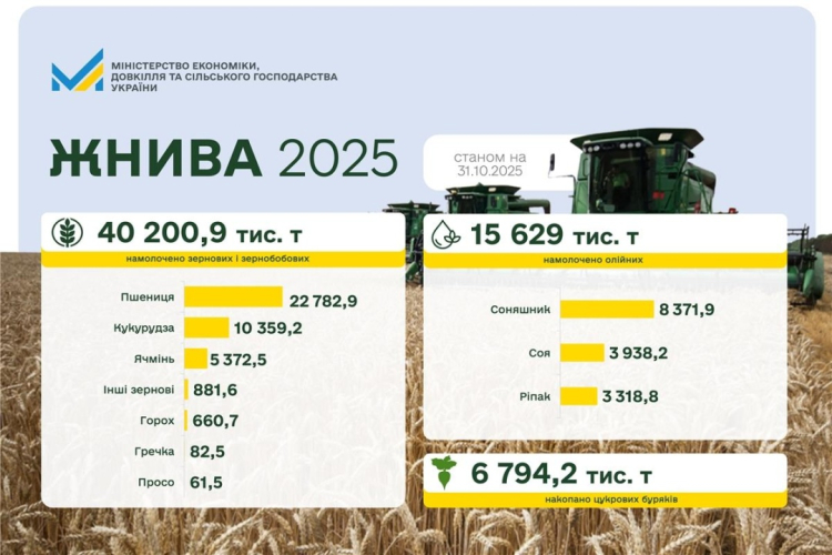"Станом на 31 жовтня в Україні вже зібрано 40 200,9 тис. тонн зернових культур на площі 8770,8 тис. га. Обмолочено 76% площ, засіяних цими культурами", – ідеться в повідомленні.