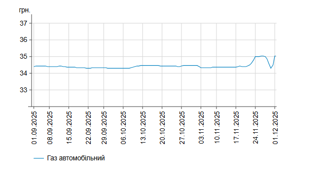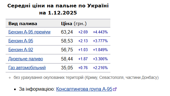 Зокрема, зафіксовано такі середні ціни на пальне: бензин марки А-95 (преміум) – 63,24 грн/л (здорожчав на 2,69 грн); бензин марки А-95 – 58,53 грн/л (здорожчав на 2,13 грн); бензин марки А-92 – 56,75 грн/л (здорожчав на 1,03 грн); дизельне пальне – 58,44 грн/л (здорожчало на 1,87 грн). Середня ціна автогазу становить 35,05 грн/л, що на 76 коп. більше порівняно із попереднім робочим днем – 28 листопада.