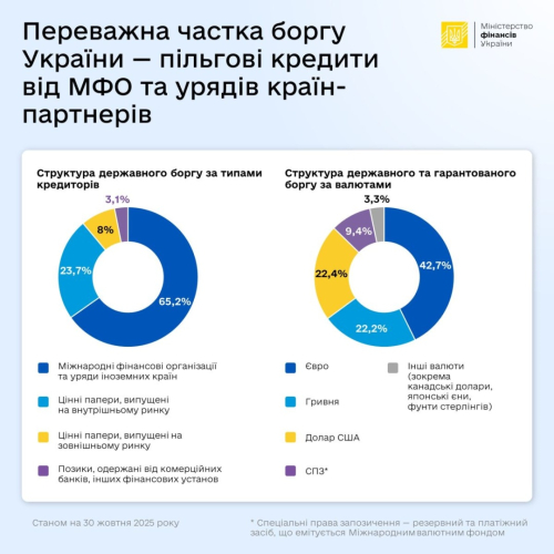 Зазначається, що станом на 31 жовтня 2025 року державний зовнішній борг становив 6 090,87 млрд грн (73,6%), або 145,12 млрд дол. США; державний внутрішній борг – 1 899,14 млрд грн (22,9%), або 45,25 млрд дол. США та гарантований державою борг — 286,2 млрд грн (3,4%), або 6,8 млрд дол. США.