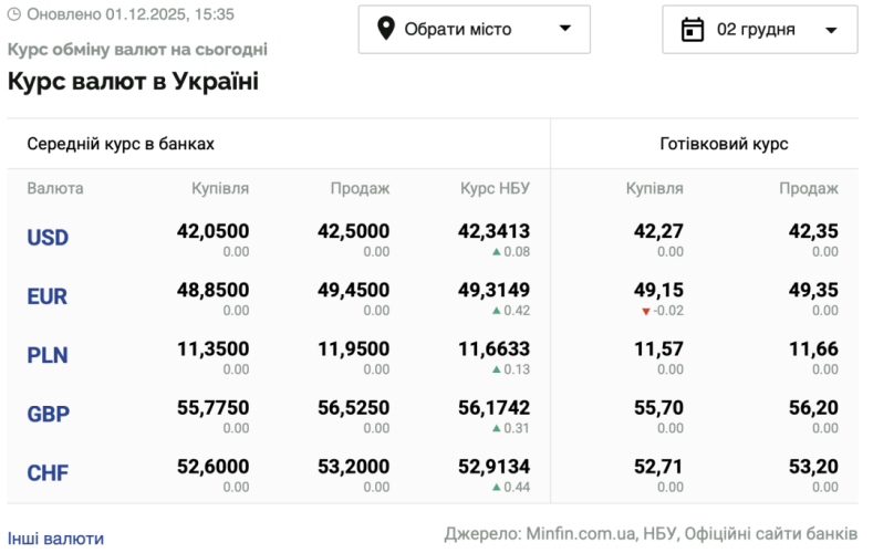 • 1 долар США – 42,34 грн (42,26 грн станом на 1 грудня);