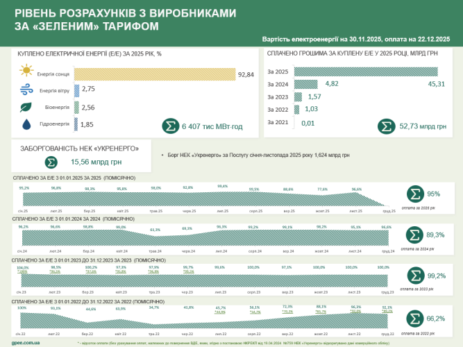 Рівень розрахунків "Гарантованого покупця" перед виробниками "зеленої" енергії становить: за 2025 рік – 95%, за 2024 рік – 89,3%, за 2023 рік – 99,2%, за 2022 рік – 66,2%.