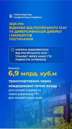 "У 2025 році Україна повністю зупинила транзит російського газу через власну ГТС: з 1 січня газотранспортна система України працює в режимі відсутності транзиту російського газу. Водночас з початку року через міждержавні точки входу протранспортовано близько 6,9 млрд куб. м газу – це як обсяги імпорту для потреб України, так і обсяги транспортування через українську ГТС для потреб інших країн", – йдеться у повідомленні.