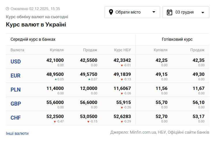 - 1 долар США – 42,33 грн (42,34 грн станом на 2 грудня);