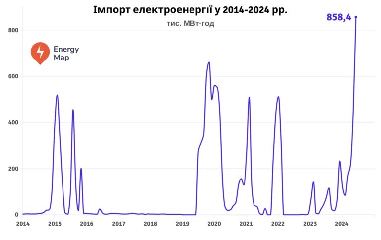 "У червні 2024 року Україна імпортувала 858,4 тис. МВт-год. електроенергії. Це на 6% більше, ніж було закуплено за весь 2023 рік (806,4 тис. МВт-год). Крім того, це найбільший місячний обсяг імпорту за останні 10 років", – ідеться у повідомленні.
