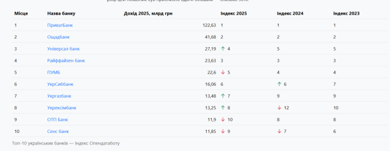ОТП Банк став одним із небагатьох, кому вдалося покращити позиції у рейтингу. Він піднявся з десятого місця на дев’яте. Його дохід у 2025 році зріс на 7% і склав 11,85 млрд грн, а прибуток збільшився у 1,3 раза — до 8,99 млрд грн.