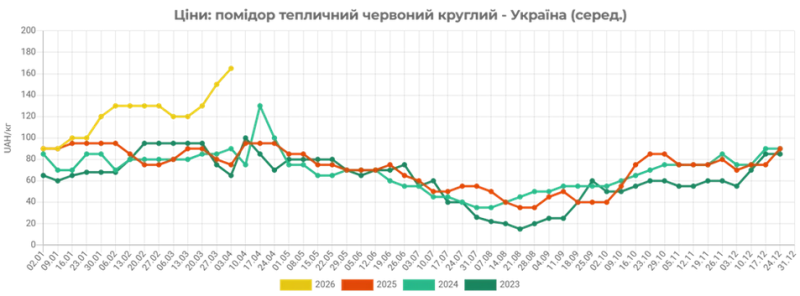 Наразі українські тепличні комбінати пропонують помідори по 150-170 грн/кг (3,43-3,88 дол./кг), що в середньому на 66% дорожче, ніж на початку минулого сезону. При цьому основну частину ринку займає імпорт із Туреччини, де ціни коливаються в межах 130-150 грн/кг залежно від якості та обсягів.