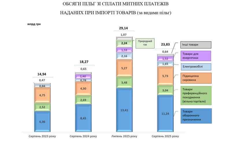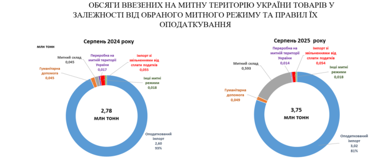 У серпні 2025 року на митну територію України ввезено 3,75 млн тонн іноземних товарів, що на 34,8% більше, ніж за аналогічний період торік; основними драйверами зростання стали нафтопродукти, легкові автомобілі та вугілля.