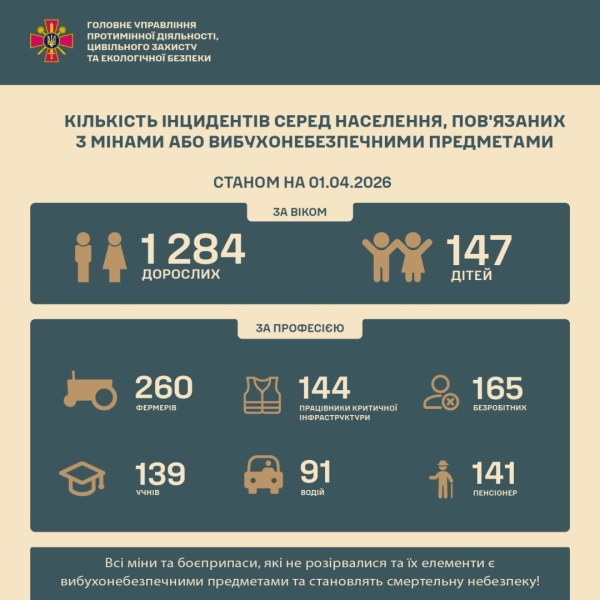 "Станом на 01.04.2026 від початку повномасштабного вторгнення рф в Україну через ворожі міни та вибухонебезпечні залишки війни постраждало 1 431 особа, з яких діти – 147, дорослі – 1 284", – йдеться у повідомленні.