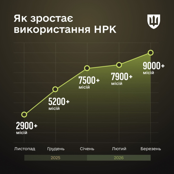 Як зазначається, в березні наземні НРК виконали понад 9 000 бойових і логістичних завдань на передовій. Для порівняння, у листопаді минулого року таких місій було понад 2 900, а в січні 2026-го – понад 7 500.