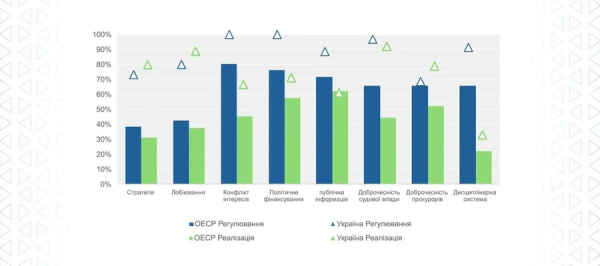 У впровадженні регуляторних (80%) та імплементаційних (89%) критеріїв у сфері лобіювання Україна є одним із лідерів поряд з Канадою, Францією та Естонією. Українське законодавство, на відміну від більшості країн-членів та країн-партнерів ОЕСР, передбачає прозорість інформації про бенефіціарних власників, санкції за порушення правил лобістської діяльності, а Реєстр прозорості містить найповніший набір даних про суб’єктів лобіювання, їх діяльність та витрати (аналогічна ситуація лише в Румунії).