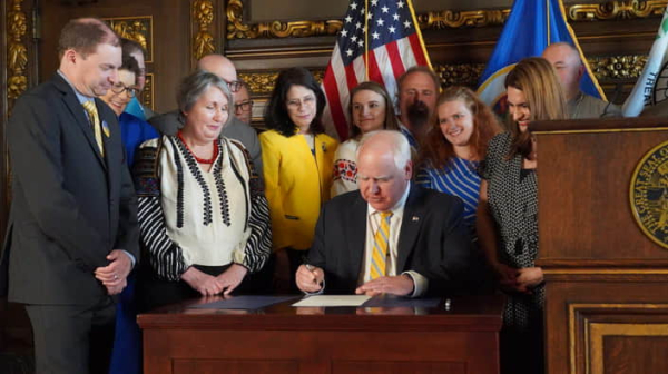 Тім Волз (у центрі) в присутності представників української діаспори підписує закон, що розриває контракти публічних компаній штату Міннесота з РФ. Фото з офіціального твіттера губернатора