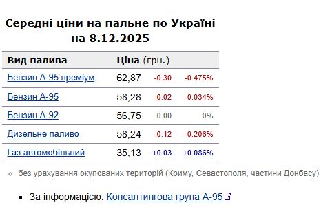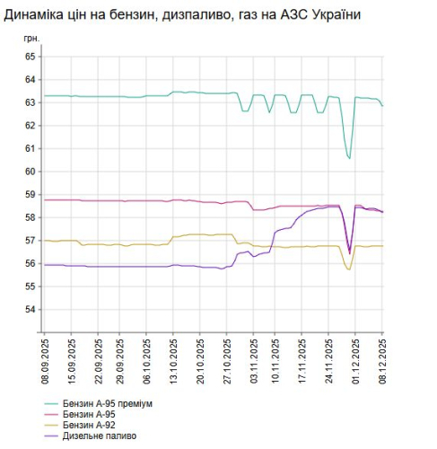 У понеділок, 8 грудня, середня ціна на бензин марки А-95 знизилася на 2 коп. до 58,28 грн/л, на дизельне пальне – на 12 коп. до 58,24 грн/л.