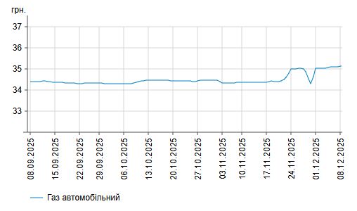 Зокрема, зафіксовано такі середні ціни на пальне: бензин марки А-95 (преміум) – 62,87 грн/л (здешевшав на 30 коп.); бензин марки А-95 – 58,28 грн/л (здешевшав на 2 коп.); бензин марки А-92 – 56,75 грн/л; дизельне пальне – 58,24 грн/л (здешевшало на 12 коп.). Середня ціна автогазу становить 35,13 грн/л, що на 3 коп. більше порівняно із попереднім робочим днем – 5 грудня.