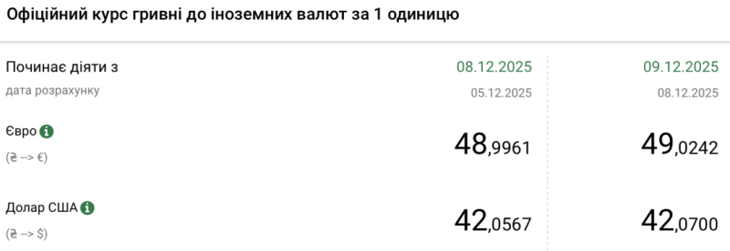 - 1 євро – 49,02 грн (48,99 грн станом на 8 грудня).