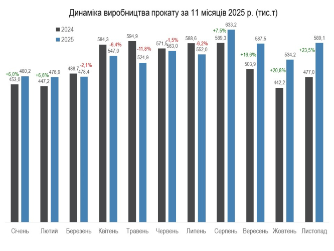 У виробництві прокату за звітний період зафіксовано зростання обсягів на 3,9% – до 5,74 млн т. При цьому порівняно з жовтнем 2025-го виробництво прокату збільшилося на 10,3%%, у річному вимірі – на 23,5%.