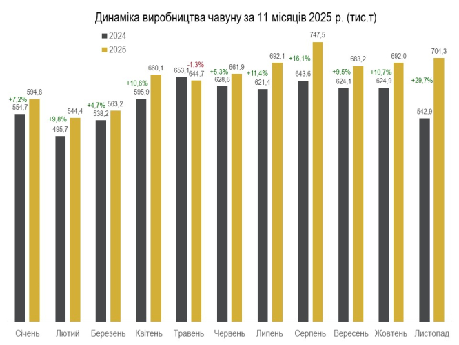 Згідно з даними об’єднання, українські металургійні підприємства за 11 місяців виплавили 6,52 млн т чавуну, що на 10,2% більше, ніж за аналогічний період торік. Зокрема, у листопаді виплавлено 704,3 тис. т, що на 1,8% більше, ніж у жовтні. Порівняно із листопадом 2024 року зафіксовано зростання на 29,7%.