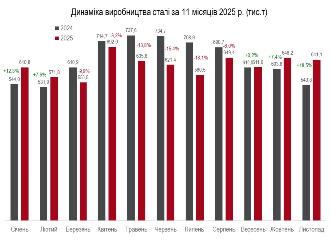 Водночас виробництво сталі протягом січня – листопада скоротилося на 3,1% – до 7,02 млн т. У листопаді обсяги виплавки сталі перевищили показник минулого року на 18,5%, сягнувши 641,1 тис. т, проти жовтня вони впали на 1,1%.