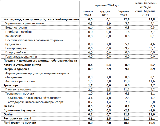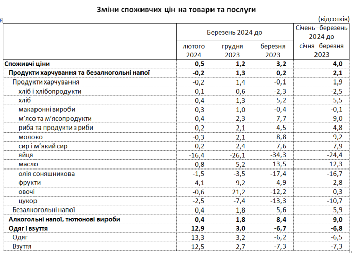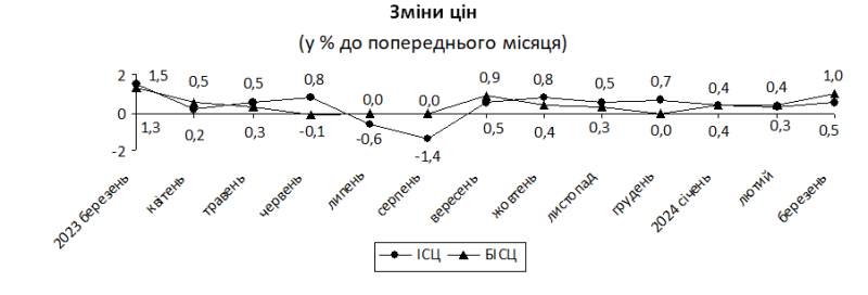 "Інфляція на споживчому ринку в березні 2024 року порівняно із лютим 2024 року становила 0,5%, з початку року – 1,2%", – йдеться у повідомленні.