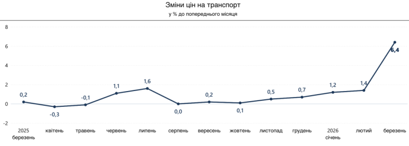 Ціни на транспорт зросли на 6,4% головним чином через подорожчання палива та мастил на 13,2% (річний показник – 23,4%) і проїзду в залізничному й автодорожньому пасажирському транспорті на 8,2% і 6,0% відповідно.