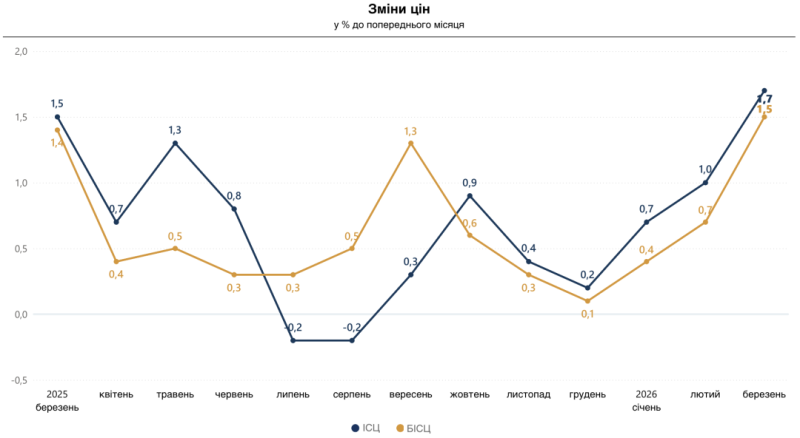 Найбільше подорожчали яйця: Інфляція у березні становила 1,7% Інфографіка 09.04.2026 15:13 Укрінформ Інфляція в Україні у березні 2026 року становила 1,7% проти попереднього місяця і 7,9% – у річному вимірі.