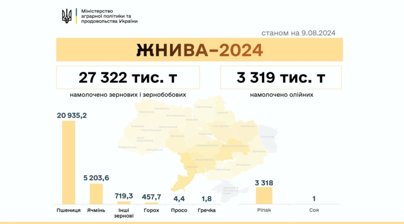 У Мінагрополітики повідомили, що аграрії Буковини, Вінниччини, Київщини, Полтавщини, Одещини, Херсонщини, Кіровоградщини та Черкащини завершили збирання ранніх зернових та зернобобових культур. Збір гречки та проса розпочали у Дніпропетровській, Одеській, Харківській та Херсонській областях.