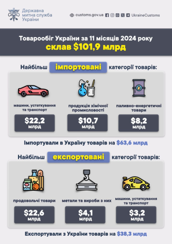 Як повідомляв Укрінформ, за січень-жовтень 2024 року товарообіг України становив 92 млрд дол. США.