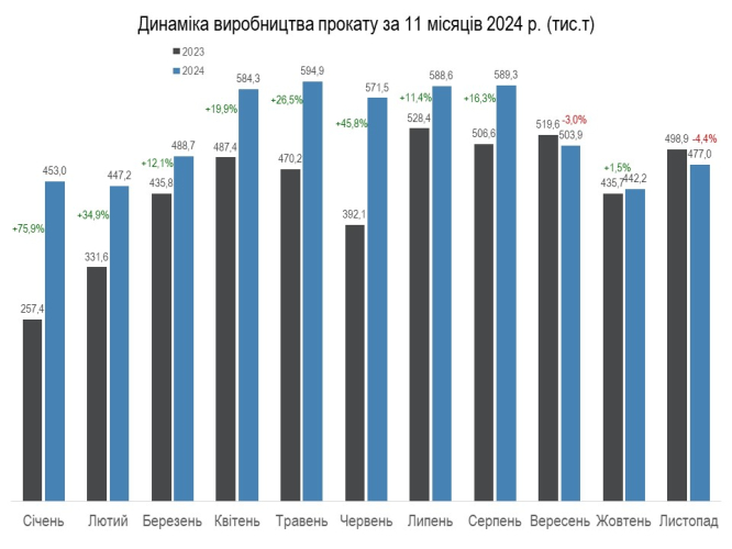 Виробництво металопрокату з початку року становило 5,74 млн т (+18% до показника за 11 місяців 2023 року). У листопаді було виготовлено 477 тис. т прокату, це на 7,8% більше, ніж у жовтні.