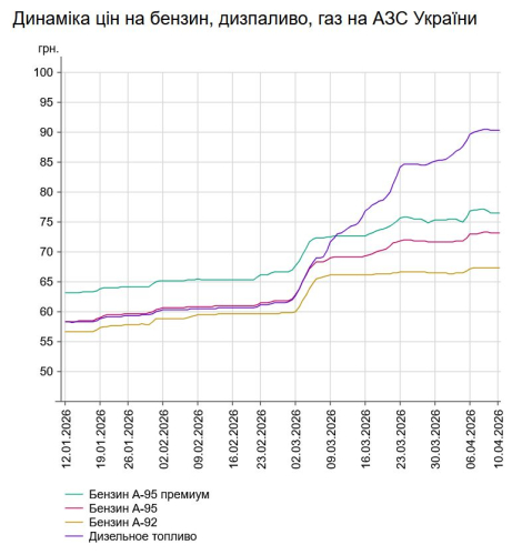 Як повідомлялось, у четвер, 9 квітня, середня ціна на бензин марки А-95 знизилася на 15 коп. до 73,17 грн/л, на дизельне пальне – на 17 коп. до 90,34 грн/л.