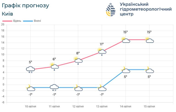 Температура вночі 1-6° тепла (на поверхні грунту, у західних, північних, Вінницькій, Черкаській областях, 11і квітня на Одещині та Миколаївщині й у повітрі заморозки 0-3°); вдень 5-13° тепла.