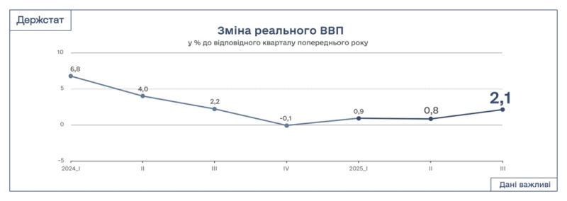 За попередньою оцінкою, реальний валовий внутрішній продукт України у третьому кварталі 2025 року зріс на 0,8% порівняно з другим кварталом.