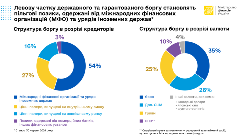 Зазначається, що станом на 30 червня 2024 року державний та гарантований державою борг України становив 6168 млрд грн, або 152,2 млрд дол. США.