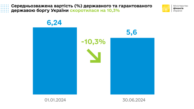 При цьому середньозважена вартість державного та гарантованого державою боргу України з початку 2024 року скоротилася на 10,3% – з 6,24% до 5,6%.