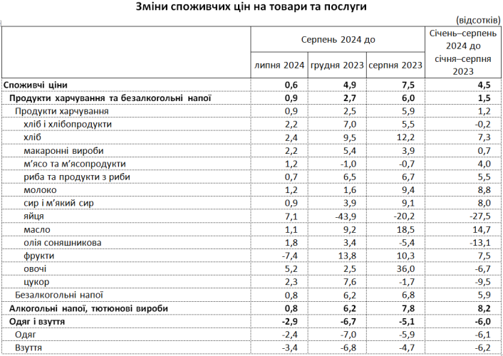 Наголошується, що на споживчому ринку в серпні ціни на продукти харчування та безалкогольні напої зросли на 0,9%. Найбільше (на 7,1% та 5,2%) подорожчали яйця та овочі. При цьому у порівнянні із серпнем минулого року ціни на яйця зменшилися на 20,2%, тоді як овочі подорожчали на 36%.