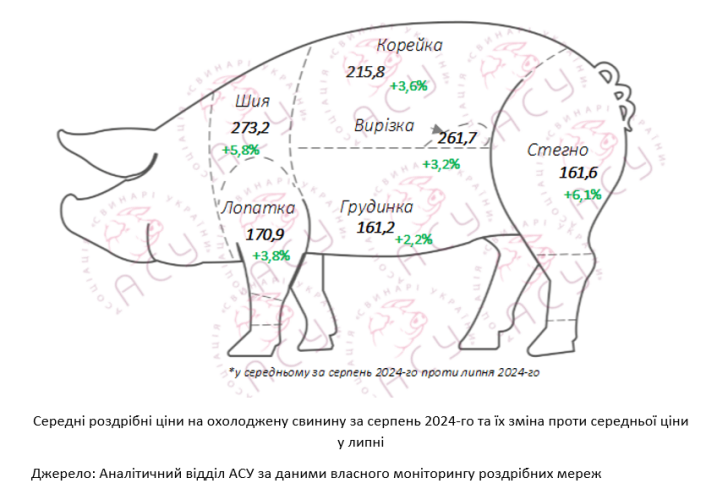 В АСУ пояснили, що преміальні свинячі напівфабрикати і ті, на які сезонний попит вищий, не завжди відповідають загальному тренду. Зокрема, стейк, вирізка та ошийок цього року дорожчі, а серпневе зростання цін на м’ясо шиї та стегна показує вищі темпи приросту цін.