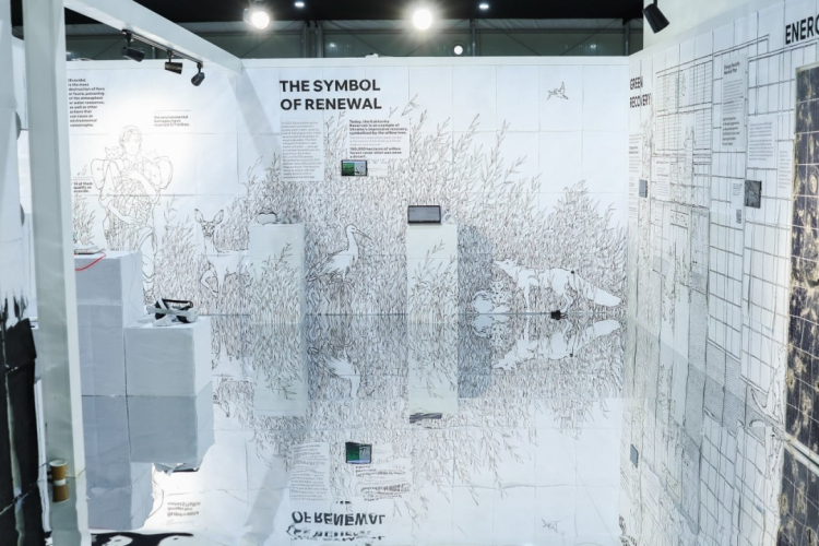 За інформацією Міндовкілля, головним матеріалом павільйону став український екологічний папір з живим насінням різнотравʼя. На ньому художниця Олександра Жумайлова створила зображення площею понад 120 кв.м, розмістивши 50 ключових екологічних ініціатив держави, бізнесу та громадськості України. Серед них — технології цифровізованого землеробства, розробки у сфері відновлюваної енергетики та розмінування, стартапи, що створюють папір з опалого листя, ловці вуглекислого газу, екологічна альтернатива пінопласту, мобільні заводи-принтери та інші українські інновації, що вже використовують у США, Великій Британії та Японії.