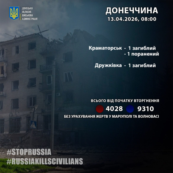 Армія РФ минулої доби вбила двох жителів Донеччини і ще одного поранила 13.04.2026 08:31 Укрінформ Російська армія минулої доби, 12 квітня, вбила двох жителів Донецької області і ще одну людину поранила.