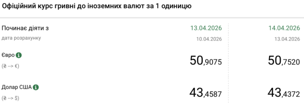 - 1 долар США – 43,43 грн (43,45 грн станом на 13 квітня);