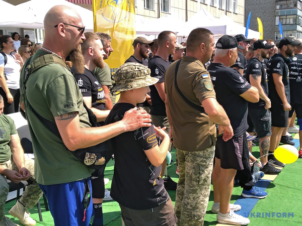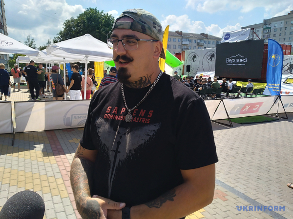 Згодом звертаю увагу на кількох чоловіків у футболках учасників змагань, які щось активно обговорюють. Пропоную поспілкуватися, на що вони усміхаються і делегують найвищого з гурту. Це військовослужбовець Артем Марченко з Борисполя. Він починає розмову, жартуючи: «Почекайте, поправлю вуса, щоб гарно вийти в кадрі».