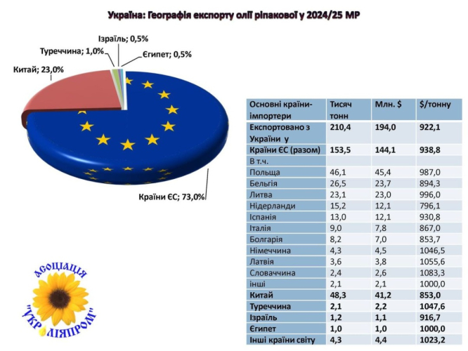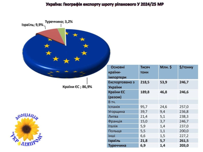 За липень-серпень 2025 року в Україні було перероблено близько 60 тисяч тонн насіння ріпаку, що дозволило виробити та експортувати 25 тисяч тонн ріпакової олії.