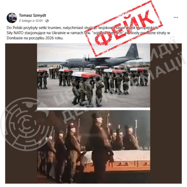 «Колишній польський суддя Томаш Шмидт, який перебуває в розшуку за підозрою у шпигунстві на користь Білорусі та отримав білоруське громадянство, опублікував у Facebook допис із фотографіями трун, стверджуючи, що «до Польщі прибули сотні тіл», а сили НАТО в межах Коаліції охочих нібито зазнали великих втрат на Донбасі на початку 2026 року», – йдеться в повідомленні.