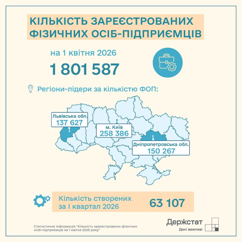 За даними Держстату, станом на 1 квітня 2026 року в Україні зареєстровано 1 801 587 фізичних осіб – підприємців. На 1 січня їх було 1 781 972.