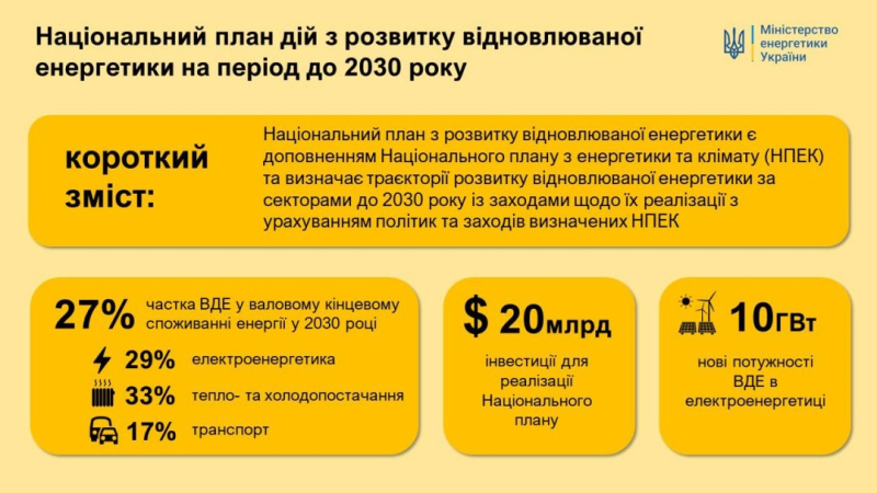 "Відповідно до плану, частка ВДЕ у валовому кінцевому споживанні енергії у 2030 році становитиме 27%, а саме: в системах теплопостачання та холодопостачання – 33%; у виробництві електроенергії – 29%; у транспортному секторі – 17%", – йдеться у повідомленні.