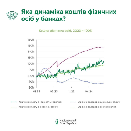 НБУ також проаналізував фактори, що призвели до ситуативного зменшення банківських вкладів населення в липні, до основних причин віднесено: сезонність – люди традиційно витрачають більше влітку через відпустки; купівлю альтернативних джерел енергії через перебої з електропостачанням; підвищений попит на іноземну валюту через тимчасове послаблення гривні; збільшення інвестицій у державні облігації (ОВДП).