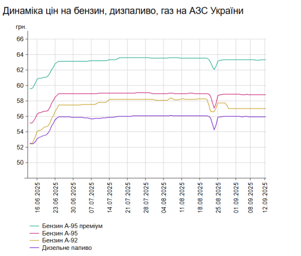 Як повідомлялося, у четвер, 11 вересня, середня ціна на бензин марки А-95 зберігається на рівні 58,78 грн/л, на дизельне пальне – зросла на 1 коп. до 55,93 грн/л.