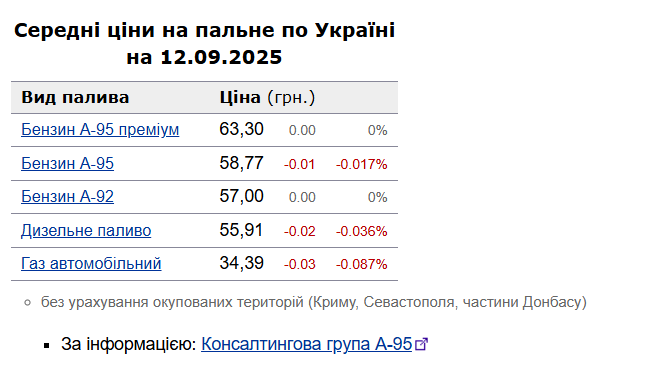 У п'ятницю, 12 вересня, середня ціна на бензин марки А-95 знизилася на 1 коп. до 58,77 грн/л, на дизельне пальне – на 2 коп. до 55,91 грн/л.