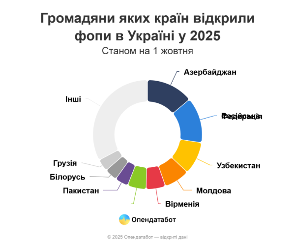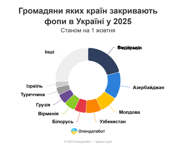 Натомість частіше за інших бізнес припиняють громадяни Росії — 241 ФОП (21%), Азербайджану — 157 (14%), Молдови — 102 (9%), Узбекистану — 91 (8%) та Білорусі — 69 (6%).
