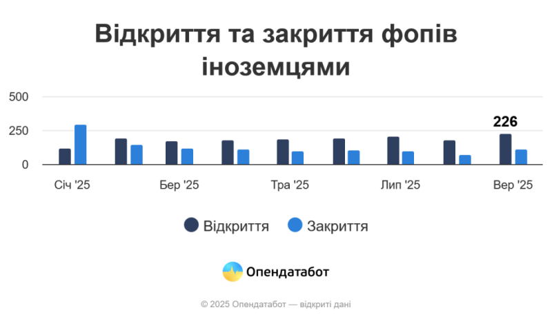 Серед загальної кількості започаткованих бізнесів частка нерезидентів становить лише 0,7%, серед закритих – 0,5%. За даними аналітиків, медіанний час роботи такого ФОПа в Україні становить 3,1 року, тоді як ФОПи українців живуть 2,5 року.