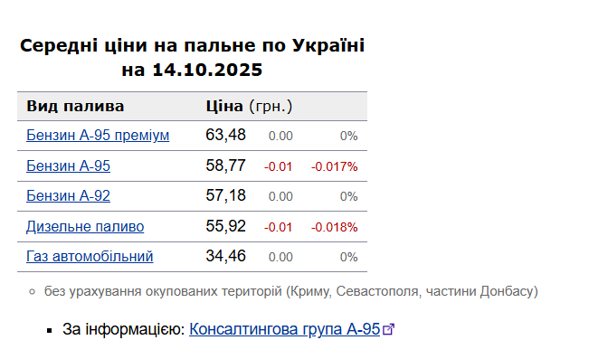 У вівторок, 14 жовтня, середня ціна на бензин марки А-95 знизилася на 1 коп. до 58,77 грн/л, на дизельне пальне – на 1 коп. до 55,92 грн/л.